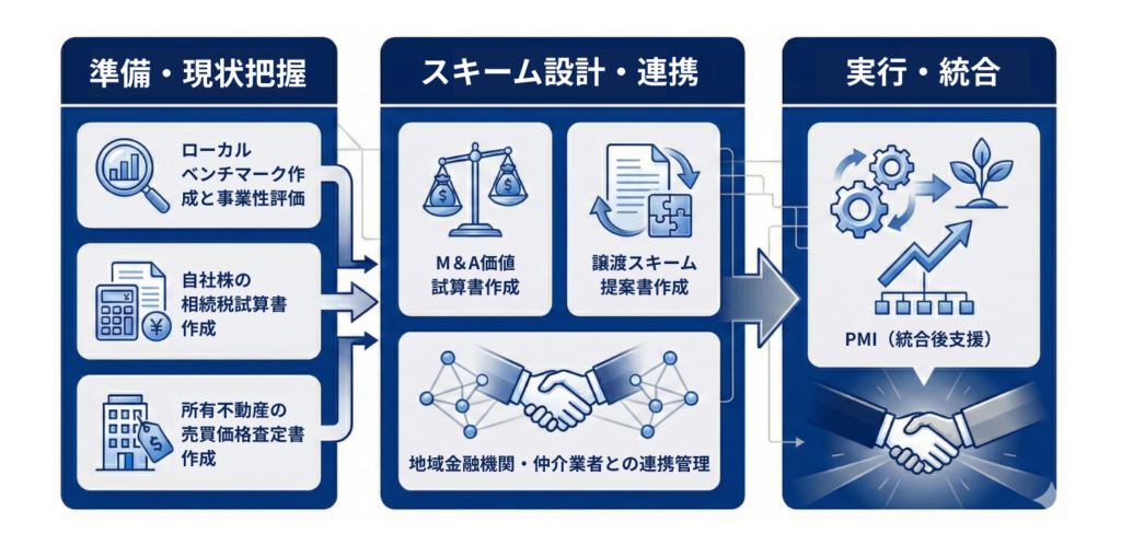 - 商圏分析、営業担当者の教育研修、アプリなど営業ツールの開発、事業承継計画の策定、承継手続きの実行支援