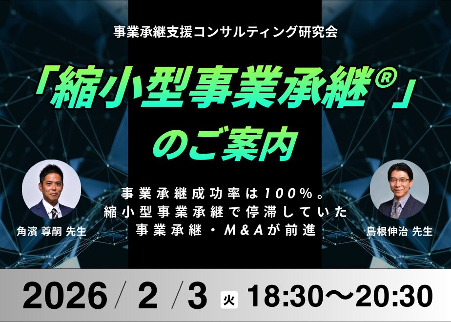 事業承継支援コンサル研究会(第100回)「縮小型事業承継®」のご紹介~事業承継成功率は100%。縮小型事業承継で停滞していた事業承継・M&Aが前進~ 2026年2月3日(火)@京橋区民館と楽しい懇親会&@Zoom