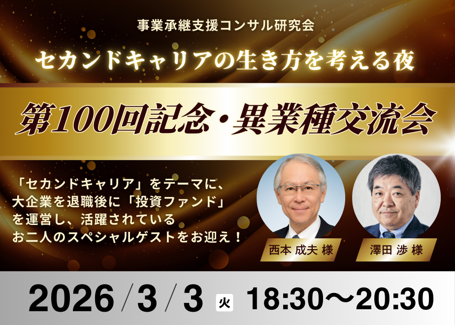 このたび、事業承継支援コンサルティング研究会は第100回の節目を迎えることとなりました。これまで長きにわたり、ご参加いただいた皆さまのご支援とご協力に、心より感謝申し上げます。 研究会の日時と場所 開催日時 2026年3月3日(火) 18:30~20:30... -